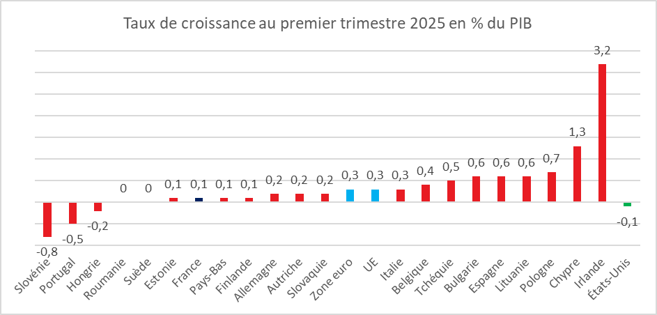 Au cours du premier trimestre 2025, le PIB des États-Unis a diminué de 0,1% par rapport au trimestre précédent (après +0,6% au quatrième trimestre 2024). Par rapport au même trimestre de l’année précédente, le PIB a augmenté de 2,0% (après +2,5% au trimestre précédent). Avec une croissance de 0,1 %, la France se situe au-dessous de la moyenne européenne. A noter que l’Allemagne avec une croissance de 0,2 % est sortie de la récession dans laquelle elle était plongée depuis deux ans.